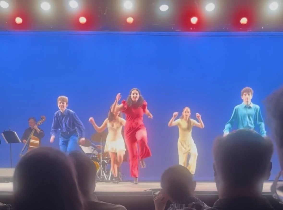 Tap It Forward founder Arden Sehgal dancing onstage with her Tap Ensemble.